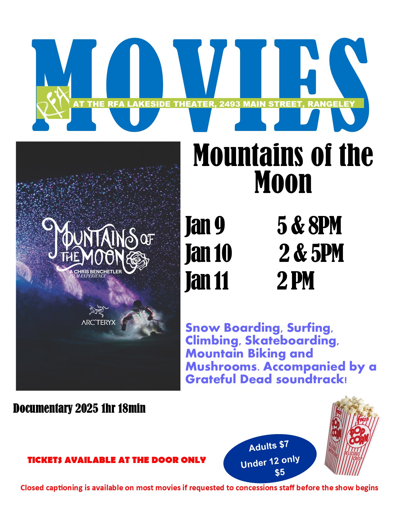 Doors open 45 minutes prior to start time, and our full concession stand, including beer/wine, will be available. Closed captioning is available on most movies if requested to concessions staff before the show begins.