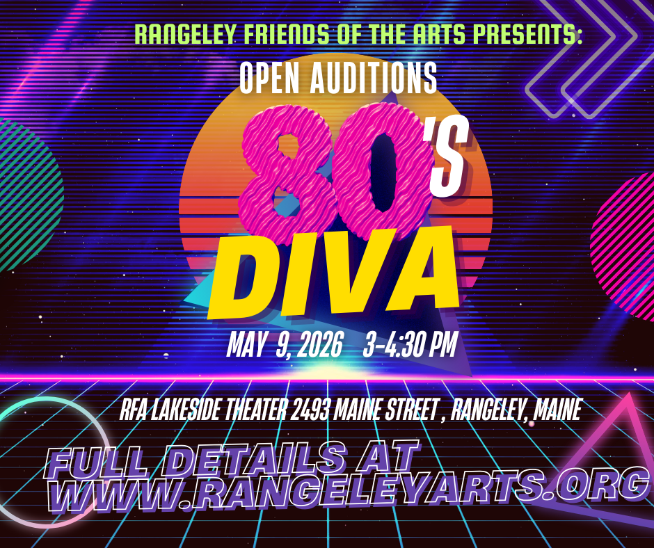Open Auditions for 80's DIVA Saturday May 9th 3:00 – 4:30 PM RFA Lakeside Theater OPEN AUDITIONS FOR THE RFA DIVA SUMMER 2026 SHOW! Rangeley’s favorite musical event returns to the stage in August! The Rangeley Friends of the Arts will produce a live musical, 80's DIVA, in August. Auditions will be held at the […]